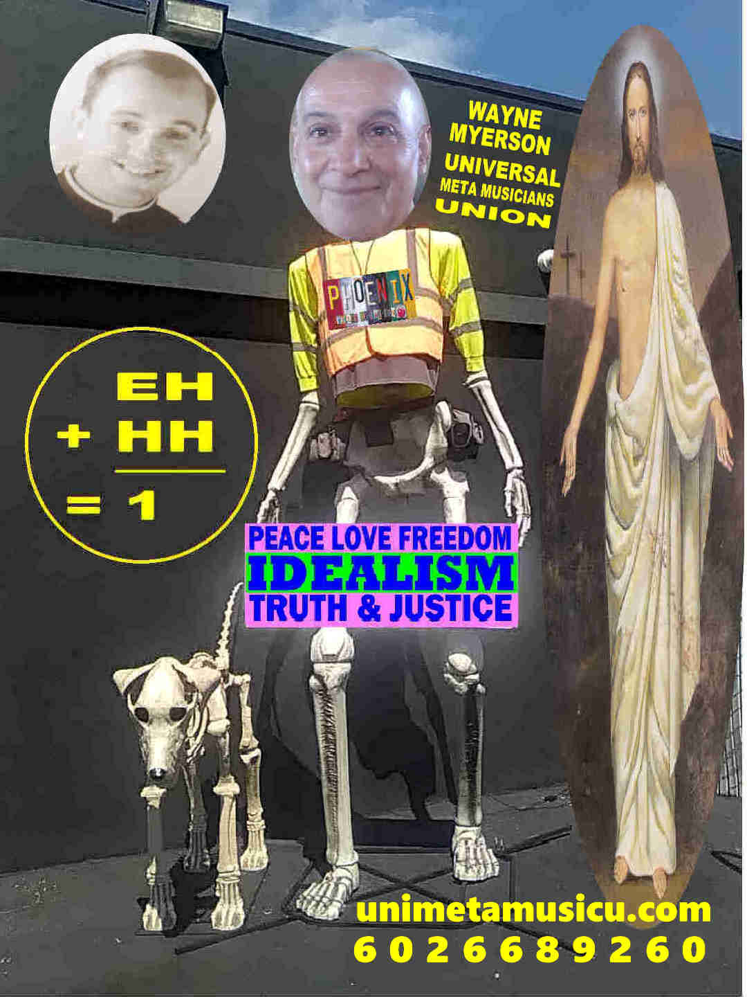 The Universal Meta Musicians Union is the house band, owned and operated in Phoenix, Arizona by Wayne Myerson, self proclaimed and self ordained meta music minister and ambassador for Christ, to promote the dual meta philosophy and geopolitical system of IDEALISM in the service of GOD, humanity and all life on earth. The most important song performed by the band is HELP ME JESUS. A song ideal to sing in every church in the world. The most amazing way to support the band is wearing a HELP ME JESUS headband. The most earnest prayer for the band is help me JESUS make peace, share love, guarantee freedom, tell the truth and serve justice. Amen.